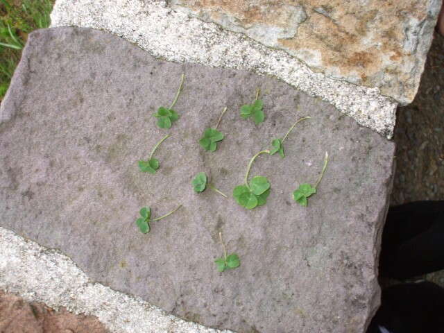 Oh yeah. Princess Sunshine found a four leaf clover. Then she started looking for them, and she managed to find nine more in under five minutes. Makes me wonder what the hell is flowing through the Delaware Water Gap. She also found, but did not pick, a five leaf clover. (No she did not find a ten leaf clover, and the fact that that question occured to you does not make you anywhere near as clever as you think it does.) |