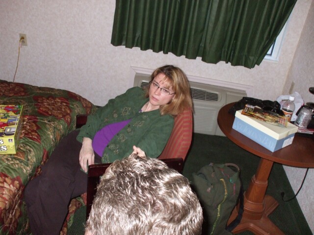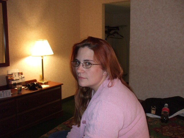 PinkLady, framed neatly between a lamp and a soda bottle in our dump of a hotel room. Seriously, we asked for a room next to Doc Trauma's. He got 224 and we got 150, which (this will shock and amaze you) are not located next to each other. Room 150 was right off the lobby and it was the handicapped-equipped room. There were all sorts of extra railing around the toilet and shower. The remote control for the television was missing, which I am sure is convenient to handicapped people. There was no clock radio. There was nothing in the sink to aerate the water so when you turned the water on, it splashed out all over you. The shower made a sound like a lawnmower whenever it was used. And at one point the twin lights between the beds came on at random, untouched. On the plus side, we didn't have to spend too much time there, thanks to the aforementioned Doc Trauma. PinkLady, sorry to turn a photo of you into a rant about our hotel room, but I had to bitch about it somewhere, and it happened to occur with this photo. |