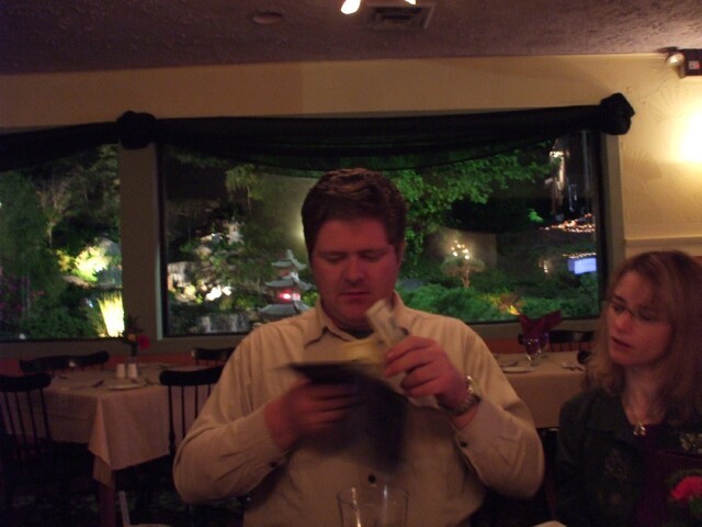We went here for dinner because it was within walking distance of the hotel. We walked in, were shown to a table, and handed menus. I opened mine and noticed a menu entry that read, with no further explanation, "CHICKEN AND SHRIMP - $27.95." At the top of the menu was a reference to the "Banquet For Two" at a price of $81.50, which sounds like a lot until you do the math and realize that works out to only $40.75 per person. The five of us all looked at each other and realized that we could communicate telepathically, because we were all clearly thinking the same thing. We promptly put the menus down and went back to the hotel. An idea was floated, actually. We considered eating there, then, when the bill arrived, handing the waiter a twenty, saying softly, "Hey... We know Merle," and giving that cool double-point wink gesture to indicate that we all understood what was going on and that the bill was handled. But, we figured that wouldn't be fair to Merle, so we opted to eat somewhere else instead. |