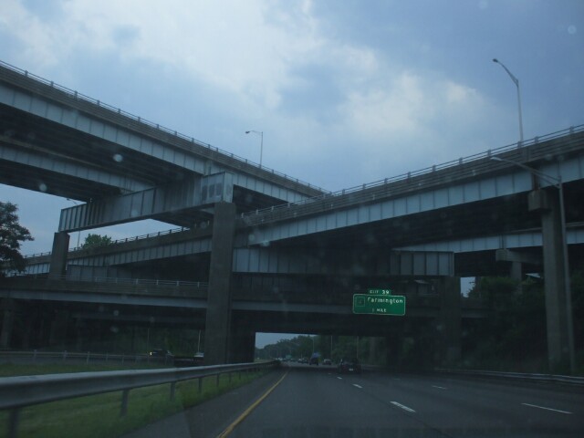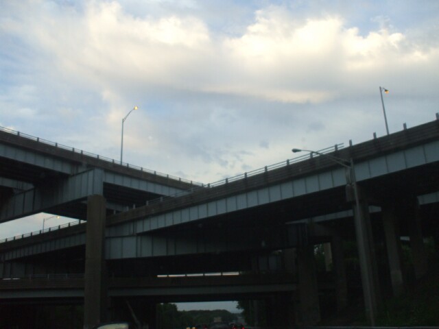 Here's the bridge stack as seen coming from the other direction as a major thunderstorm approaches. I didn't really get any photos of the thunderstorm itself because at the height of the storm I was going 30 miles an hour in the passing lane with the wipers on max, and between swipes of the wiper blades the water accumulated so fast that I could actually see it flowing down the windshield, and I would completely lose sight of the tail lights of the truck in front of me. Bad time to be taking pictures, when you're worried that even if you manage not to rear-end the guy in front of you, that the guy behind you might not be so lucky. |