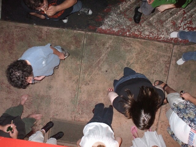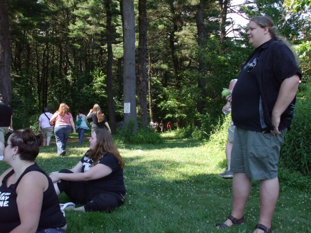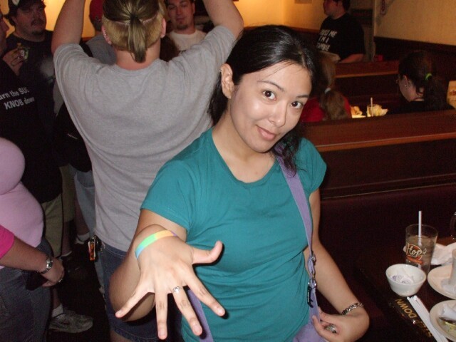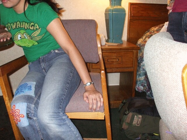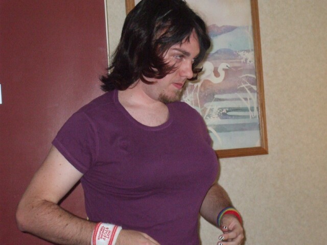 Chez Gay was hot and loud and there was some awful music playing (Aqua? Please! To each their own, but can't you do better than THAT?) but as Princess Sunshine was trying to keep a low profile and we didn't have a room of our own, there was really nowhere else for us to go. Eventually I started taking random pictures just to have something to do, and hopefully to get a few more photos that I could say something witty about. Didn't really work, though. This is one of the few that came out. Either she's somewhat upside down in this picture or I was upside down when I took it, but it was at about this time that Merric, dressed as he appears two pictures above this one, stepped over me and Princess Sunshine while we sprawled out on the floor. (No, I didn't take a picture of that either.) |