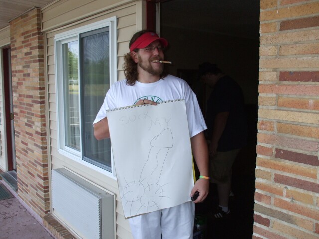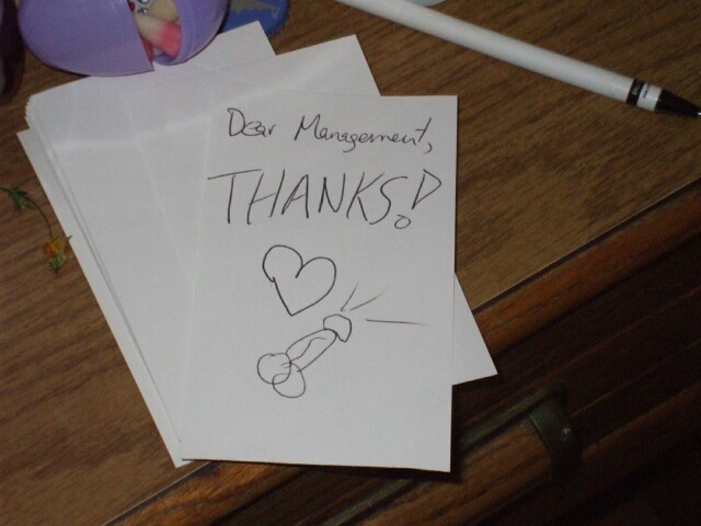 We were going to leave this message for the hotel staff, but decided instead to maintain some moral high ground. On the way out, MrGreenSmiling stopped in the office to discuss the damage to the door. I understand it didn't go well: The staff was as abusive as ever, he was telling the staff that they were trash and not worth arguing with, and eventually Drunken Irishman threatened to rip the ice machine off the wall and fling it across the office, at which point MrGreenSmiling grabbed his arm and escorted him out to the car and drove away. I have to admit, I was sorry Dazz left on Saturday, because if he had seen everything that was going on and they tried to pull this sort of shit on him, I would've loved to witness his contribution to negotiations with management. It's worth noting here, because I won't get another chance, that we were in room 174, which somehow ended up in the hands of someone else from KoL once we got kicked out. There was a woman of questionable reputation who walked into the office and asked for that room by number, calling it "the usual." She was offered a room next to it and declined. Apparently we spent the night in a room that... Well, you can put two and two together. |