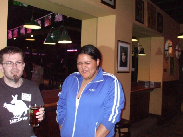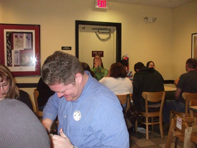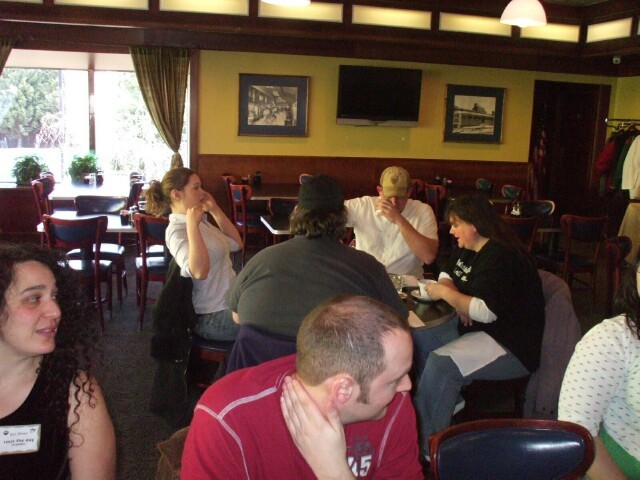 We had too many people to fit at one table, so some of them sat at another table. While we were waiting for the food to arrive, everyone at that table decided they had to have a smoke break together, much like women who go to the restroom en masse to make pasta or whatever the hell it is they do back there that requires a team effort. While they were out, the studious and dedicated though apparently not especially attentive staff walked up to the empty table and started cleaning it up. We had to tell them to stop. (By "we" I mean "MrGreenSmiling," who has a much bigger mouth than I do.) Things they had already taken they had to replace. We didn't explain what had happened when the smoke break was over, though more than one person was pleased to find their coffee cups had been "refilled" and Tealsac reportedly wondered why his spoon mysteriously disappeared. |