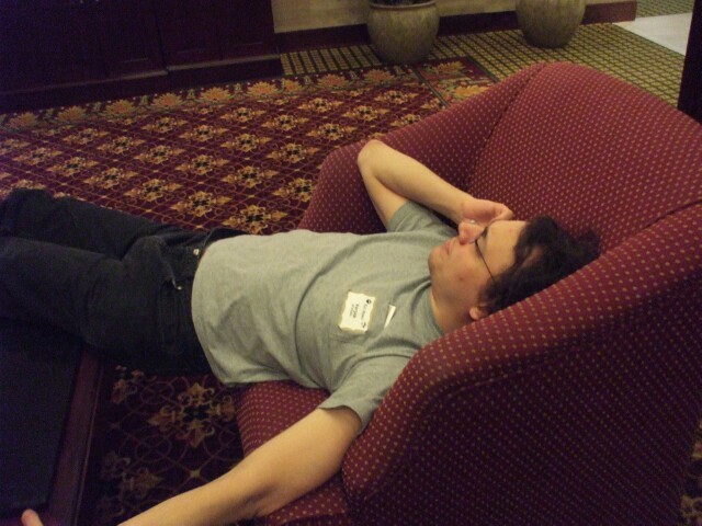This is me making a phone call from the hotel lobby. It was around this point that Dazz described me as a wreck. Considering earlier in the night I walked into the hotel bar and heard him conversationally telling someone "Well, maybe you're just a cunt," I have to feel that I got off easy. (Has anyone else noticed that, given how few photos he appears in, I am making a stastically improbable number of references to Dazz? No? Okay then, I didn't notice either.) |