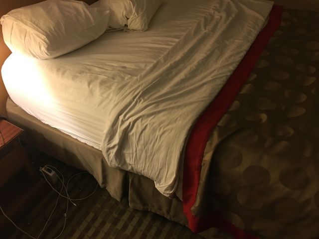 Am I the only person who just doesn't get hotel beds? The sheets here are folded back halfway down the bed and tucked in solid on both sides, so I had to circle the bed and yank the sheets out of both sides before I could get in. The "blanket" at the bottom is just a footer that covers the bottom of the bed but doesn't actually serve the purpose of a blanket. It's essentially nothing more than a large decorative knick-knack, in this case with monochrome polka dots. Does any human being ever make a bed like this in any private residence? |