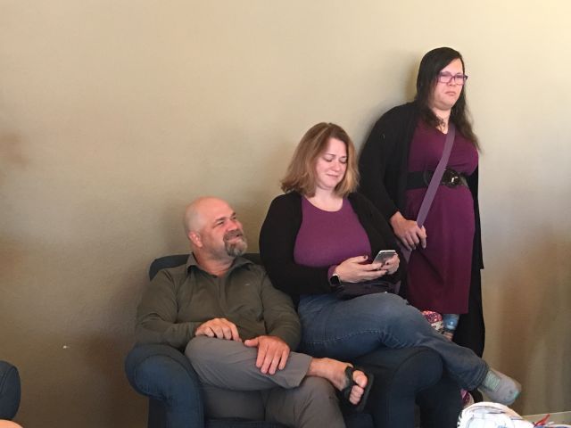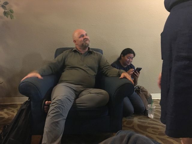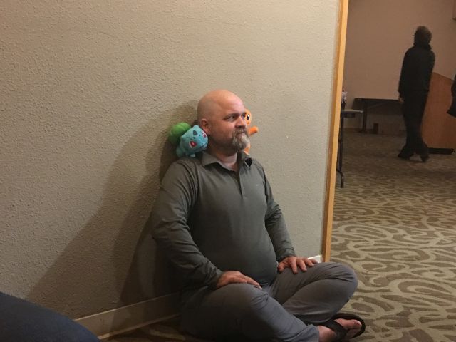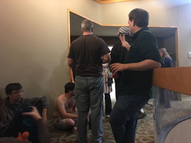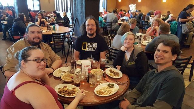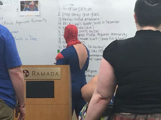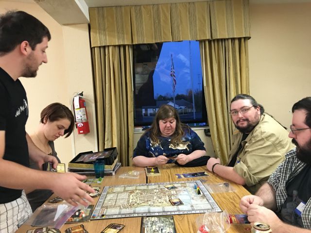 This is the first photo I have of Loathers at the meet, because when I showed up I ended spending about two and a half hours playing Cards Against Humanity and I didn't think to take a single picture. I used to bring a digital camera that was uncomfortable in my pocket so I would keep taking it out, and then since my camera was in my hand I was always taking pictures with it. Now I use the standard camera phone which works probably as well or possibly better than my digital camera which is now about a decade old, and I tend to forget I have it on me. Technology marches on. |