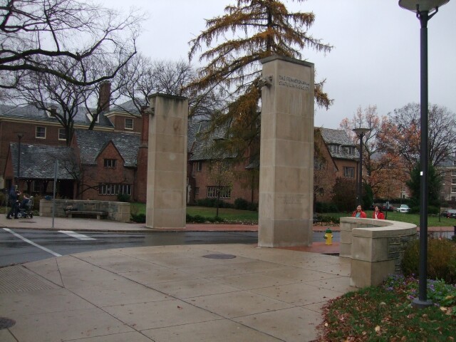 This used to be a four-way intersection (not pictured), but now it's a three-way intersection (also not pictured). The road used to continue to the main highway, but the universtiy constructed a building that spanned the highway so students could safely cross it. The building was located where the road used to be, so that road was removed. The university gates, pictured above, were where that road met the highway, so in the classic manner of bureaucratic committee compromise, the gates were moved back a block, to here, where they are located completely inside the campus, which makes about as much sense as taking the elderly Wal-Mart door greeter and moving him to the frozen foods section. You'd think a premier university would be smarter than this. It makes me sad just thinking about it. The university has slipped since I graduated. Hopefully local resident TechSmurf can get them back on track. That, or he'll have the gates replaced with statues of prolapsed rectums. |