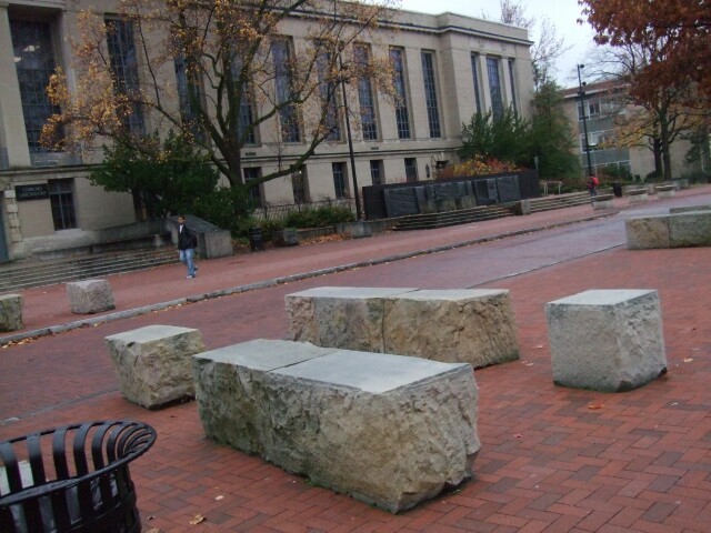 "There's no more money for benches." "Just smooth off the top of some rocks. That'll be good enough." The black object in the background is a fountain. It's turned off at this point because it was a dreary, drizzly day, and they don't want the fountain to get wet. |