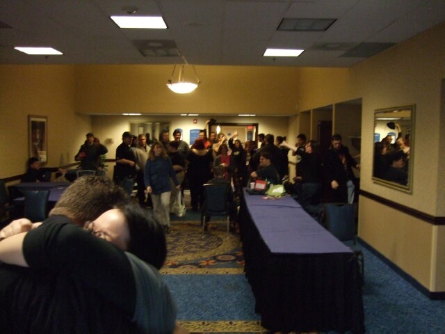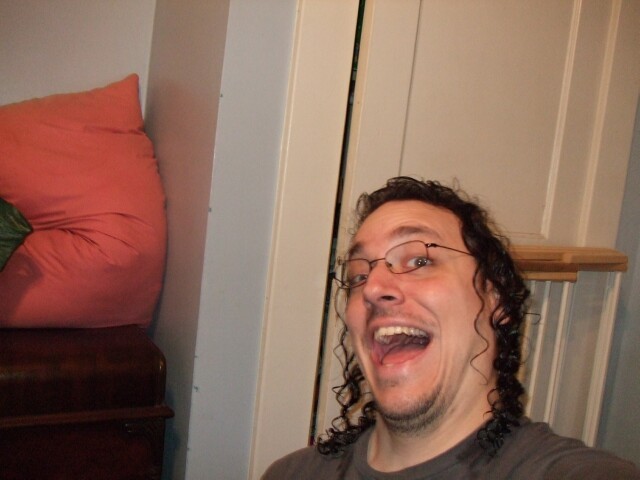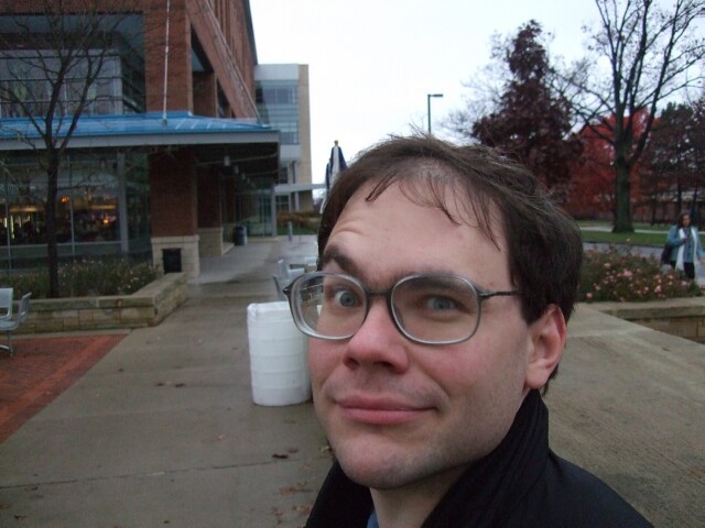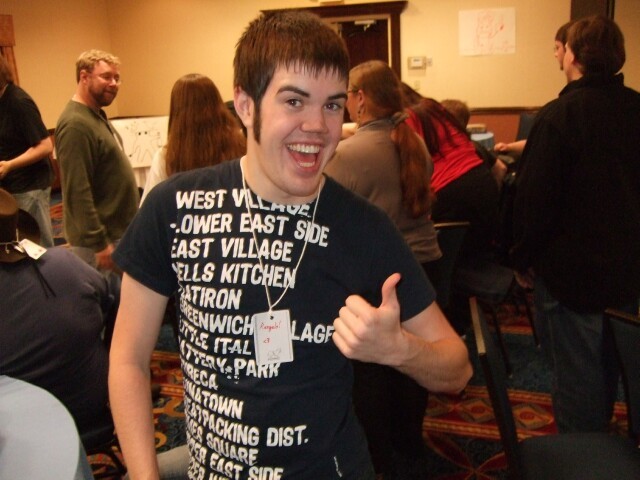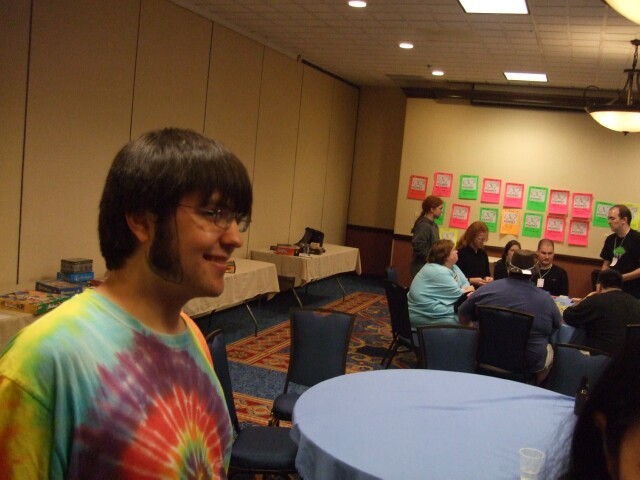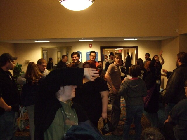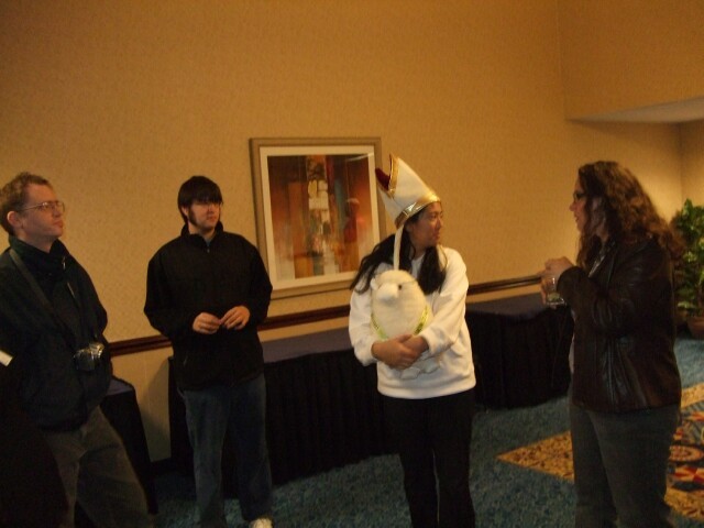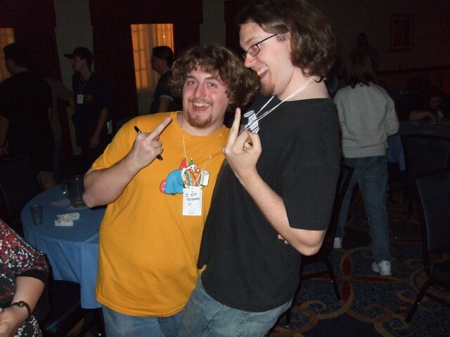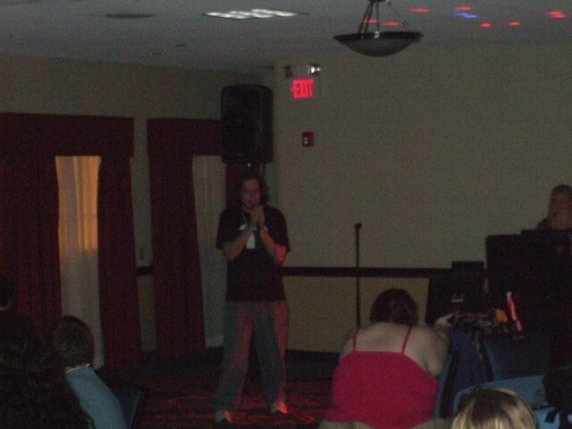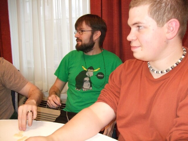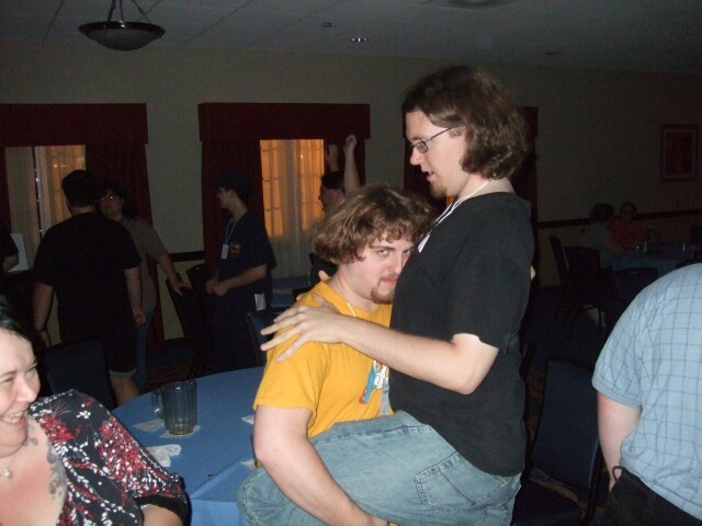 Remember John, from last year's Columbus meet photos? No, of course you don't, so stop lying. Here he is, demonstrating the ability to raise just one eyebrow, which I am incapable of doing. John also is the person who coined the name "Varjak" for me. If you're ever at Penn State and see him around, tell him I said "Hi." Also tell him I said "Gorg, son of Notar, ruler of the village people." He'll know what it means. Seriously. |