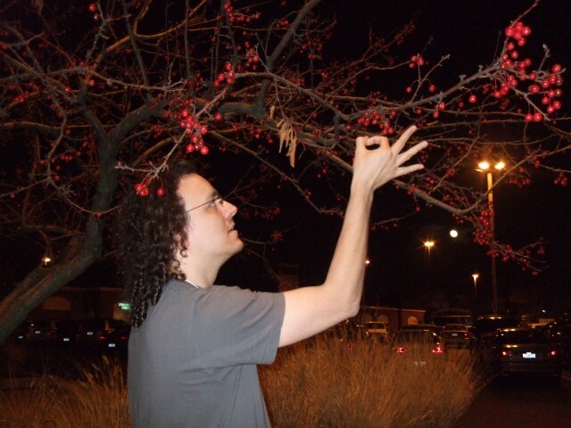 I demonstrate the fine art of flicking berries off a tree. The hardest part is not cursing when the don't go flying and you feel like you've just hit your fingernail with a very small hammer. |