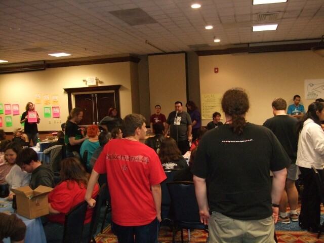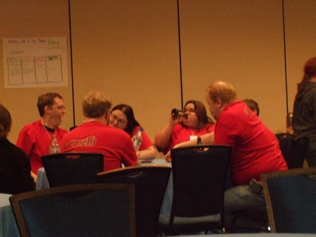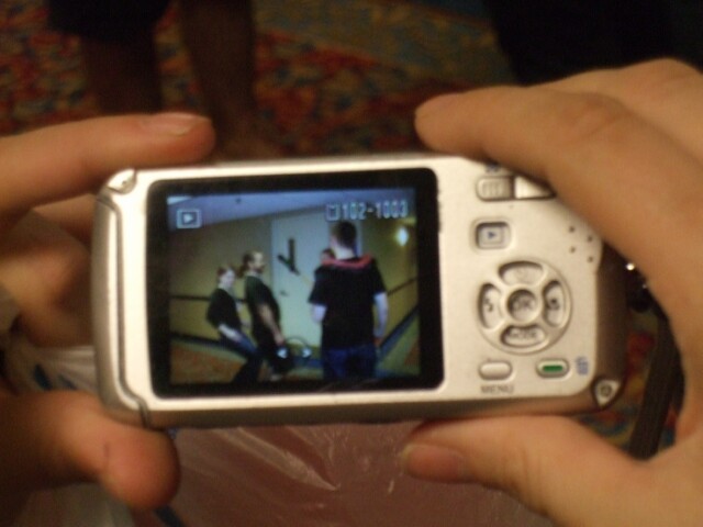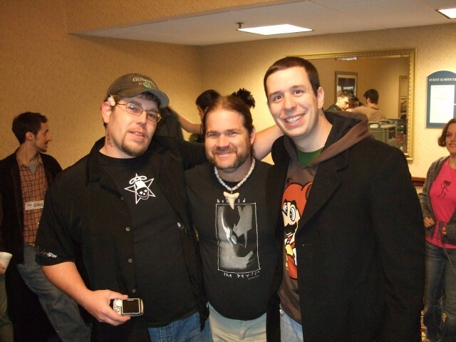 Due to a fluke of angle and background positioning, I now have a photo of MrGreenSmiling and Nsurgnie on either side of aspiring Mousekiteer rtaylor. If he gets hired, they probably won't let him wear a "behold the devil" t-shirt. |