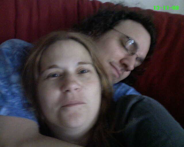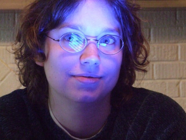 My sister in the glare of blue light, making her look like a smurf, or a frostbite victim, or possibly underwater. So many stereotypical ways to go with blue. |