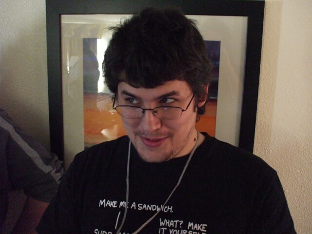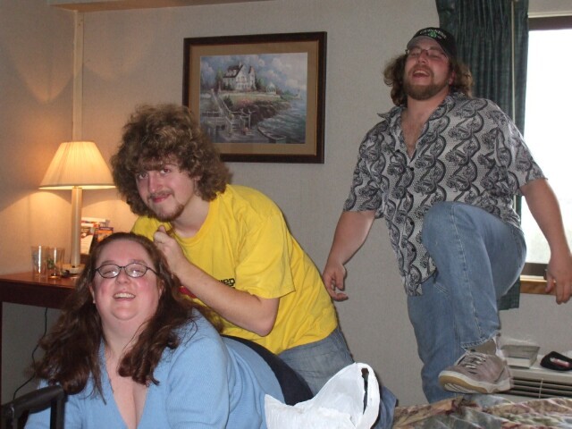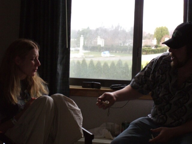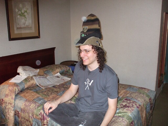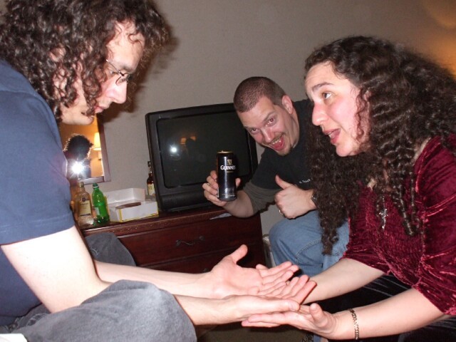 This is a demonstration on some examples and techniques of card tricks. There are times when I would have found this fascinating, but not at 2:30 in the morning in my room when I wanted to go to sleep. This is one of the hazards of KoL meets. The option is to be anti-social and avoid people, but if I want to do that, I'll just stay home. This wasn't that bad, though. The next night (morning), the lights were already out for the night when some people came in to, well, I dunno actually. I do remember the extremely considerate woman who said, "Oh, there are people trying to sleep in here. Okay, I'll smoke fast." Really warmed my heart, you know. The subsequent note that read "Leave us alone or fucking die" is currently hidden behind the dresser between the beds in the room for some future resident to find and wonder about. I do what I can to make people's lives more confusing and baffling. |
