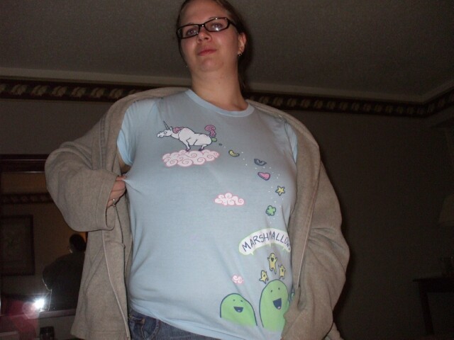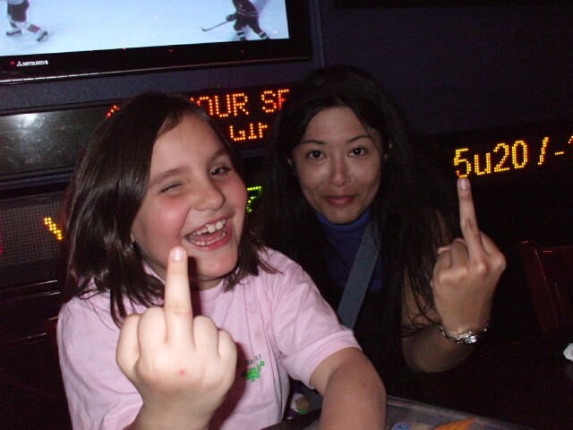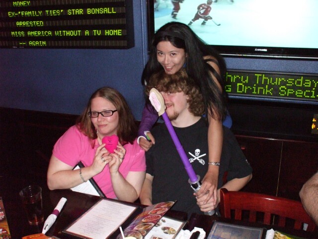 Okay, so this picture is full of cute people (and someone's not-so-cute elbow), and TechSmurf is being presented with a vagina on a stick (technically a purple light saber). The truly important thing is the horrific news that Miss America is once again without a tv home. And there's a hockey game on behind them! Why? Why wasn't the Miss America story on every channel? Why wasn't Fox News covering this 24/7? (Okay, Fox News probably was covering it 24/7, but CNN should have, too.) Why were people still allowed to travel the streets of this country freely while this august competition was without a place to be televised? Seriously, it is my opinion that anyone caught operating a beauty pageant should be shot without trial, and if the contestants are twelve or under, the parents should be shot too. |