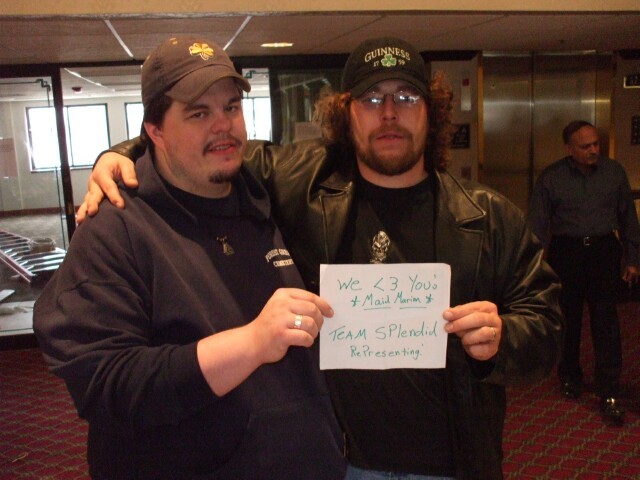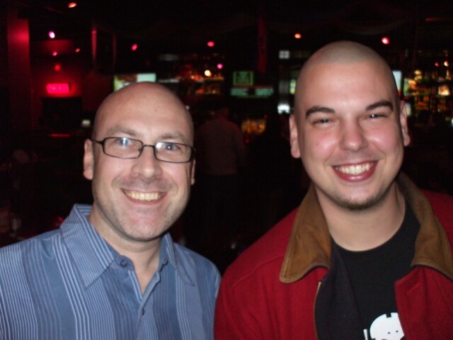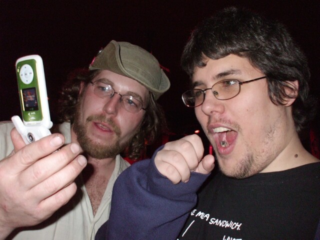 Dazz and MrGreenSmiling: Friends for life. (No, not THAT kind of "friend," you goddamn pervert! Jesus! Do you think about your mother with that brain? You disgust me.) When they first met each other they spent about fifteen minutes ripping each other apart, and I think they each convinced the other they're all right. If I hadn't caught the camera flash in the mirror behind them, they might actually be easily visible. |