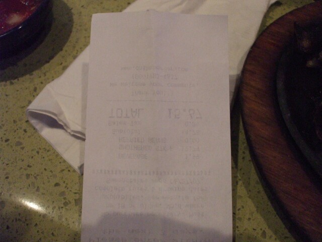This is my bill as it was handed to me. I know I wasn't recovered from the two nights before because when I looked at this I couldn't understand how my bill came out to $76.51. |